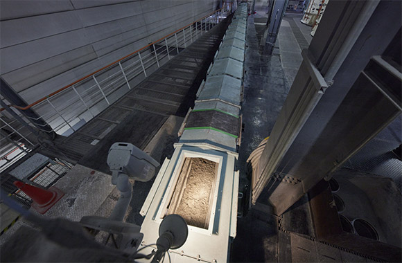 大きさの基準を満たした焼成品は製品サイロへ送られます。基準を満たさなかったものは、「③混合」工程へ戻されます。